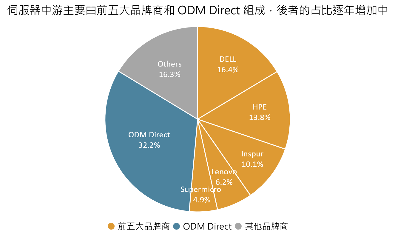 ODM 代工即是由品牌商委託伺服器代工廠負責設計和組裝代工後,由品牌廠向下游客戶進行銷售,其中品牌商主要來自中美兩國,包含了 DELL、HPE、Lenovo、浪潮(Inspur)和 Supermicro 等,而代工廠則由伺服器五虎所組成,包括廣達(市:2382)、緯穎(市:6669)、英業達(市:2356)、神達(市:3706)、鴻海(市:2317)五間臺灣廠商。