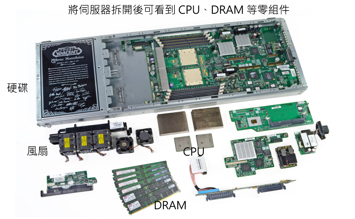 白話來說,伺服器就是一台運算更強、儲存空間更大、更穩定的大型電腦,因此與我們手邊的電腦相同,一樣有 CPU、DRAM、硬碟等裝置以及承載元件的 PCB(印刷電路板)等。