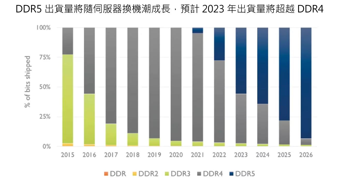 而 Intel 和 AMD 新的 CPU 架構將會首度支援 DDR5 技術,加上目前 PC/NB 尚未全面改用 DDR5 (Intel 第 12 代仍兼容 DDR4 和 DDR5,AMD 則要等到 Zen 4 才會支援),因此可預期近兩年 DDR5 的成長動能將最主要來自伺服器換機潮。而後續幾年隨著 PC/NB 推出全面採用 DDR5 的新平台,將會進一步推動需求成長。根據調研機構 Yole Developpement 預估,2022 年 DDR5 滲透率將增加至 25%,並於 2026 年取代目前 DDR4 的市場地位達 90% 以上。