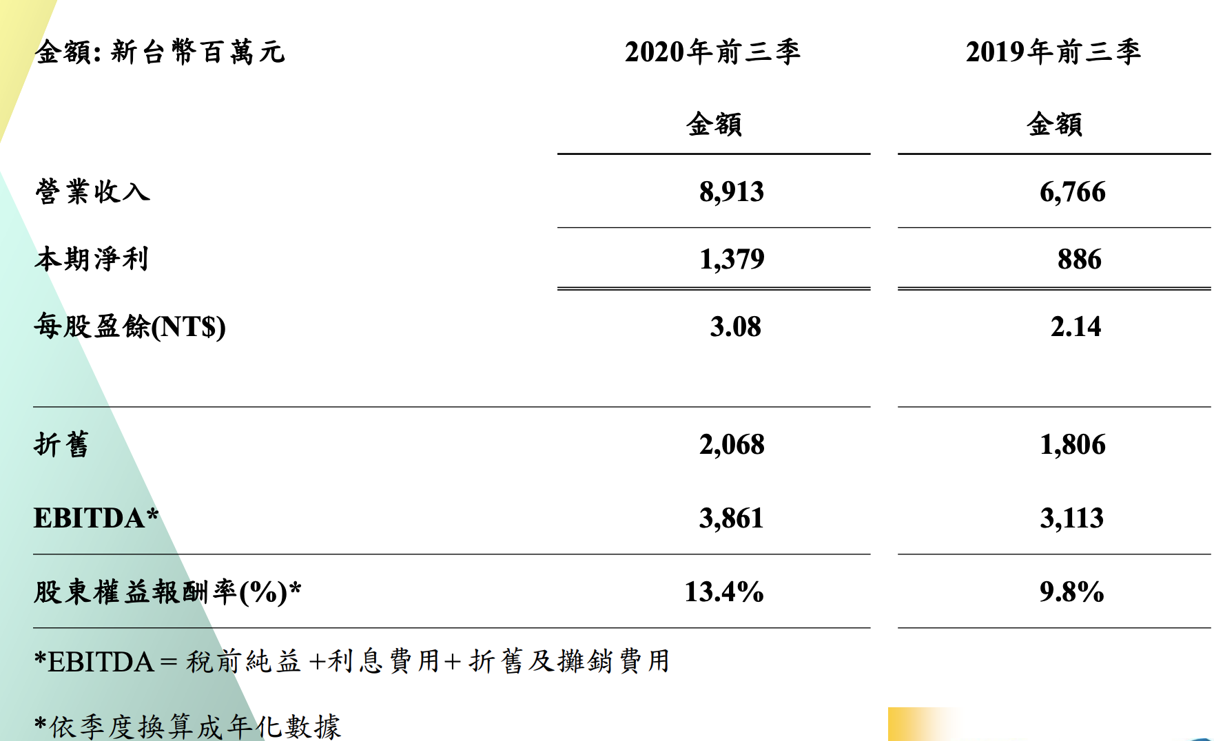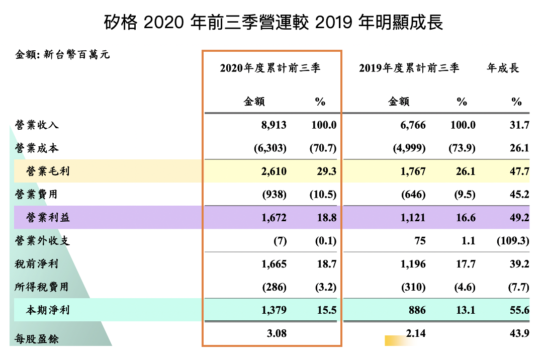 1. 矽格 2020Q3 營收為 32.96 億元,YoY+30.21%,QoQ+13.72%。2020 年累計前 10 個月營收為 100.67 億元,YoY+22.1%。展望 2020Q4,由於 5G 智慧型手機、網通、AI、車用電子等需求續強,預計 2020Q4 營收有望與 2020Q3 的 33 億元相當,2020 全年營收規模可達 122 億元以上。