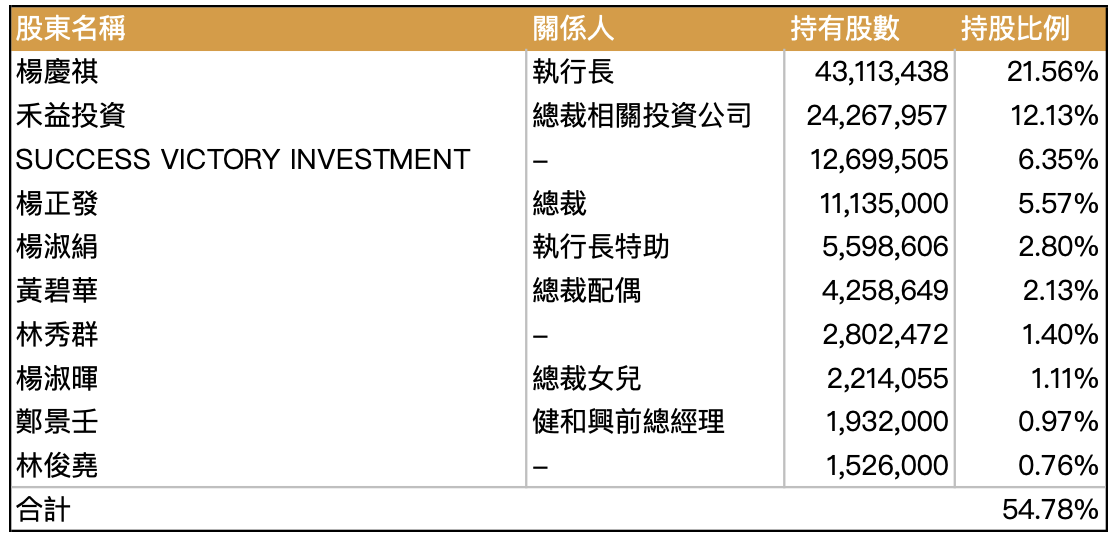 股權方面,前十大股東共計持有公司 55% 股權,其中董事長家族及其相關投資公司,共持有公司 45% 股權,整體股權高度集中。