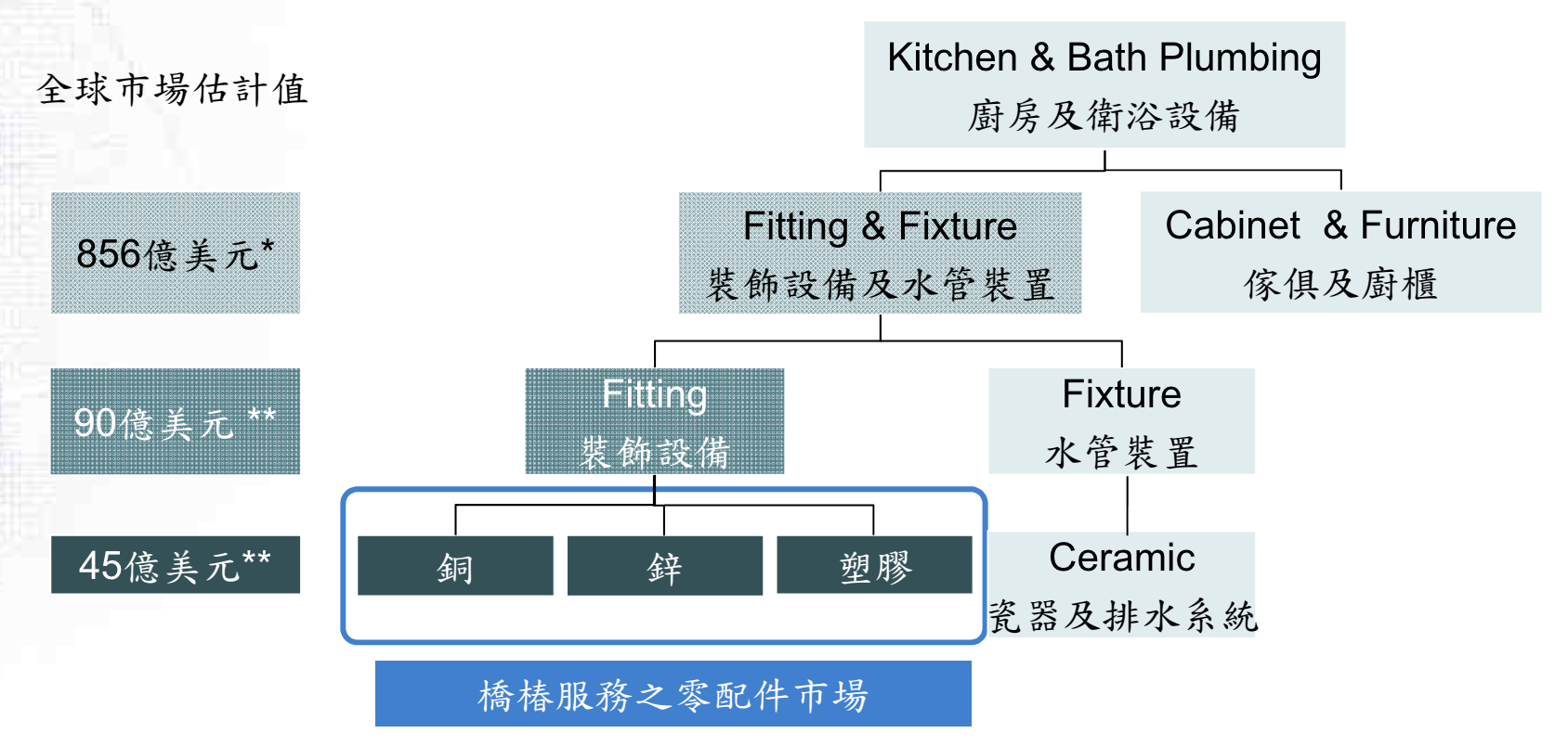 橋椿為廚房及衛浴設備下的裝飾設備產業,其中包括水龍頭、衛浴配件及淋浴系統,依零件材質可分為鋅、銅、塑膠,而橋椿目前以生產鋅製品零配件為主,鋅製品營收占比近 80%。廚房及衛浴設備為成熟產業,需求主要來自新建房屋與舊屋維修更新,其中後續維修市場成長相對平穩,因此產業需求主要受到新屋市場景氣的週期性循環影響,獲利較不穩定。