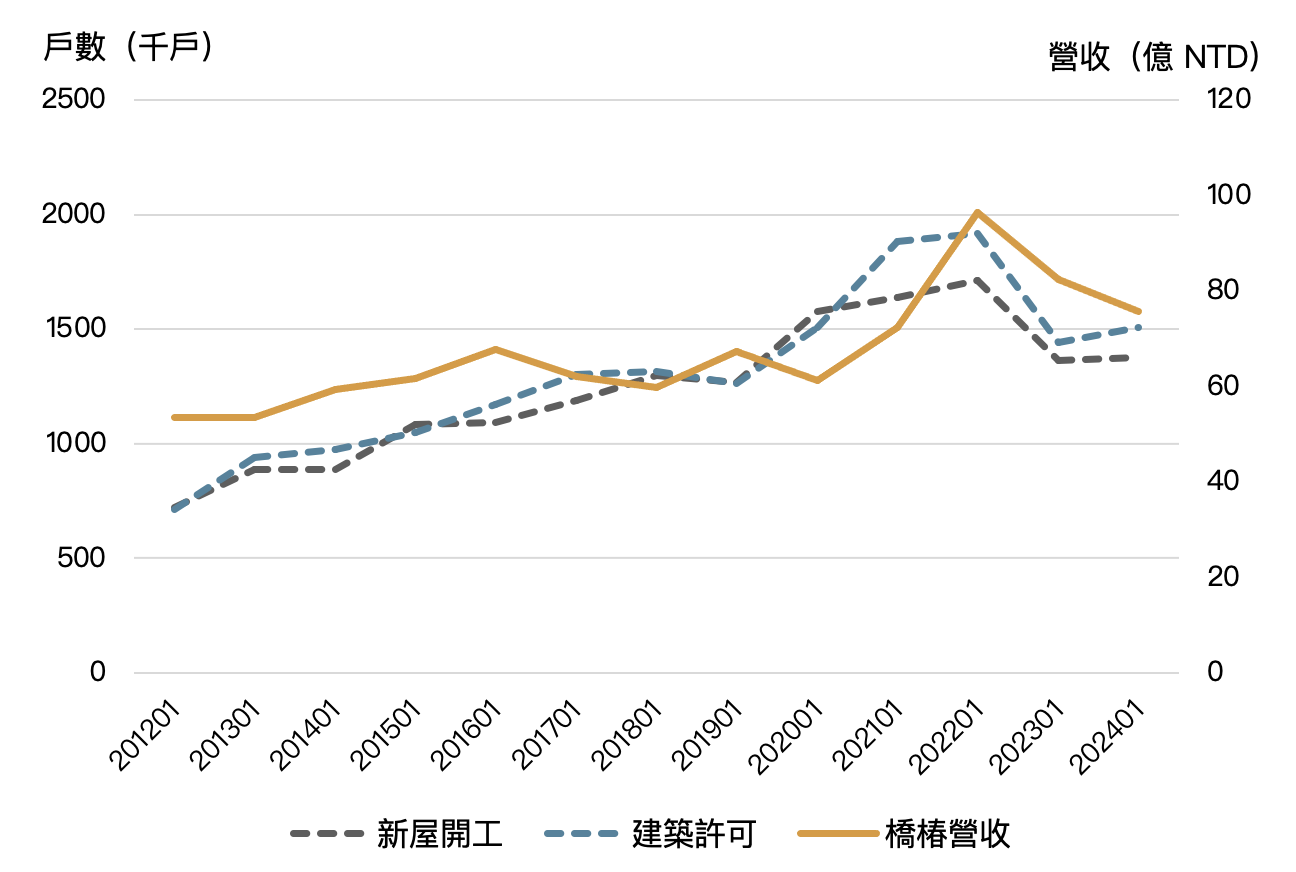 值得注意的是,2023 年營建許可戶數已有所回升,這代表後續新屋開工數量也將隨之增加,有助於橋椿在新建房屋市場的出貨量成長。