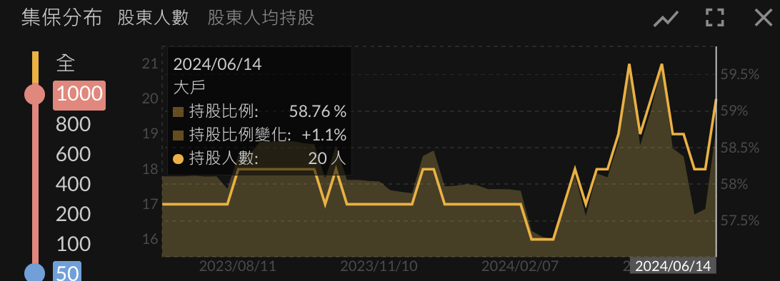 大股東人數自 2024/03 開始攀升,目前持股比例達 58.7%