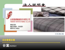 【法說會備忘錄】台富 20250606 By 法說會助理 2025-07-25 台富投專精紡織加工絲與布料,推出 Elastinana 品牌。2025Q1 毛利受國際情勢影響波動大,營運面臨關稅與匯率挑戰。公司積極研發,轉型高值工作服及產業用布,強化競爭力。 0
