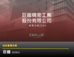 【法說會備忘錄】巨鎧精密-創 20250627 By 法說會助理 2025-07-01 巨鎧精密(2254)專注汽車 AM 改裝零配件及 LED 車燈。2025Q1 營收年增 69.2%並轉虧為盈。未來將導入 AI 智能產品,拓展懸吊、輪圈,深化北美通路,推動 ESG,目標全球領導品牌。 0