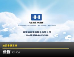 【佳醫法說會重點內容備忘錄】20251124 By 法說會助理 2025-11-24 佳醫 2024 前三季營收逾 80 億,EPS 3.57 元。血液透析與醫藥物流穩健成長,海外菲律賓健保點值挹注。醫美業務承壓待解,續拓亞洲整合醫療健康市場。 0