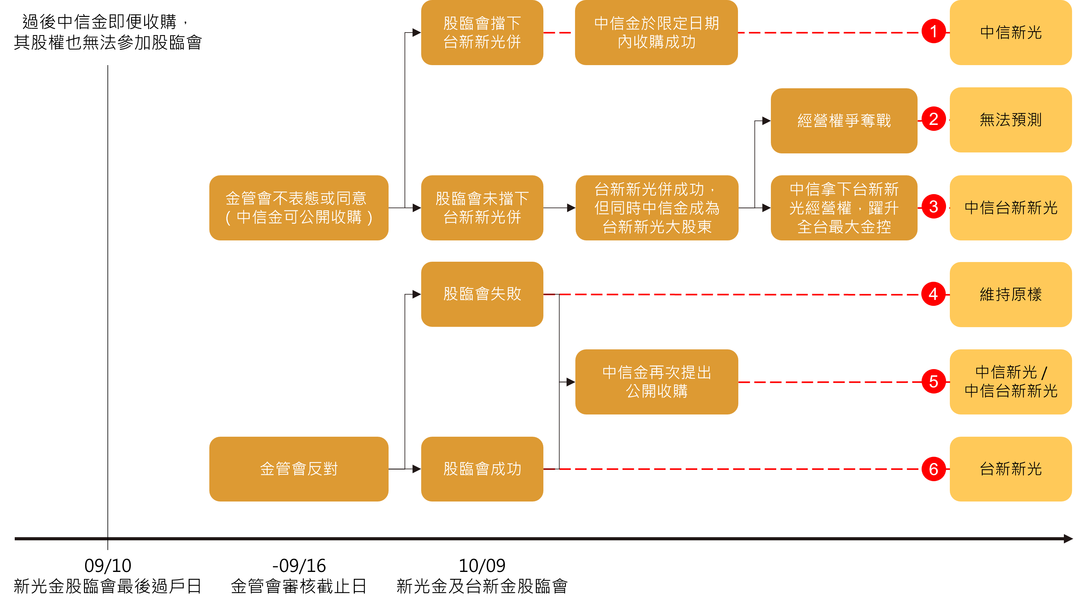 金管會審核過後,下個重要時點便是台新金及新光金的股臨會,就目前狀況來看,台新金併新光金利大於弊,而中信金併新光金有出價較高的優勢,故新光金較可能出現正反兩派僵持不下的情況,造成下圖幾種類型的事件發展。