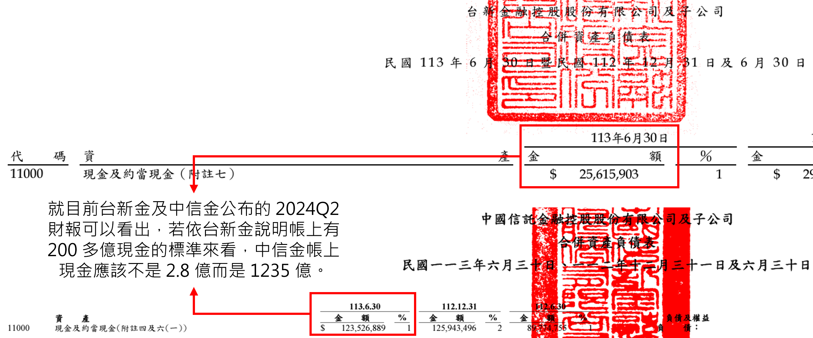 中信金帳上現金實質上有 1235 億,非台新金所稱之 2.8 億