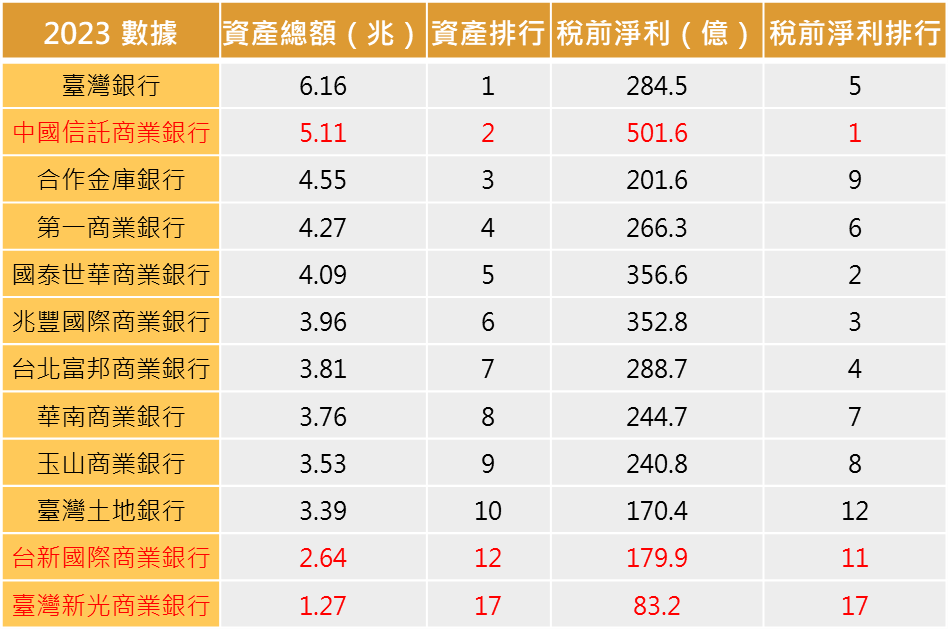台新銀行及中國信託銀行都較新光銀行規模大,且中國信託銀行更是台灣銀行業的獲利龍頭