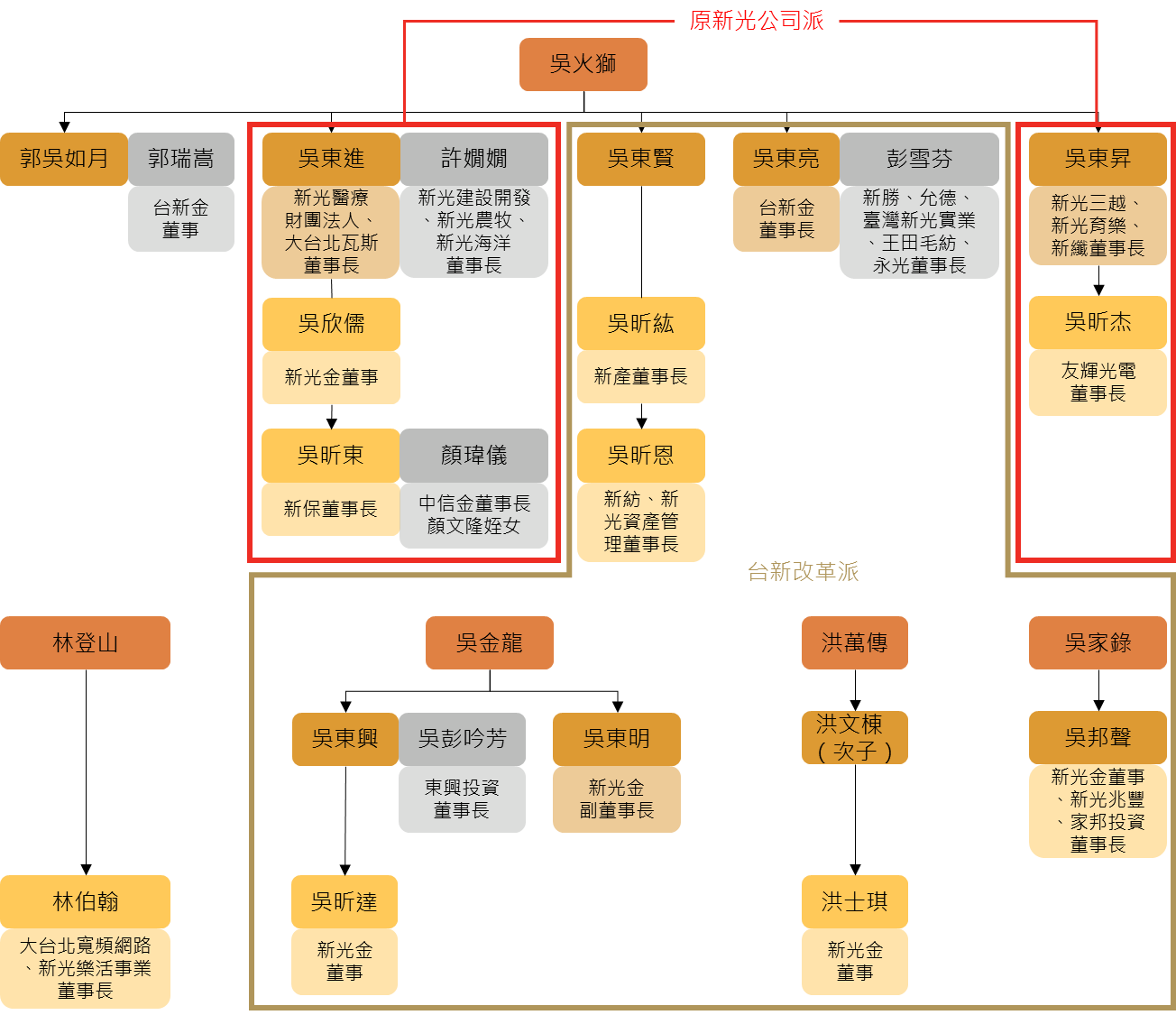 台新改革派(約 7.4%):主要來自吳彭吟芳掌控之東興投資;吳昕恩掌控之新紡(市:1419);彭雪芬掌控之新勝股份、新柏股份、台灣新光實業及王田毛紡;吳邦聲掌控之家邦投資及台北市吳家錄保險文教基金會;以及新光金旗下新壽退休基金等。總共約持有 7.4% 股權。
