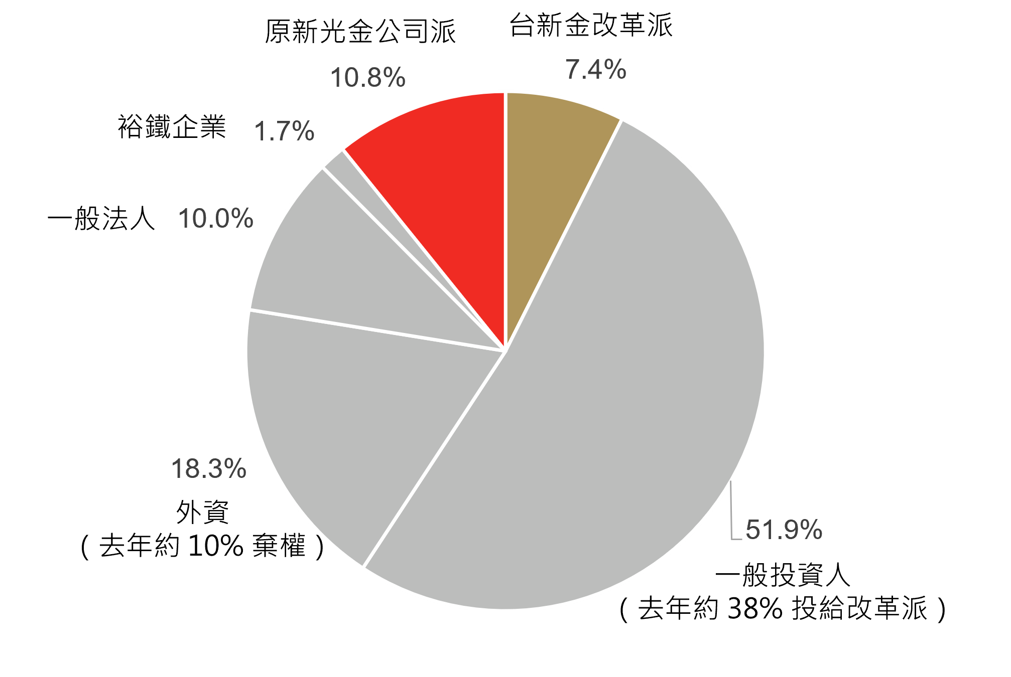 原新光公司派(約 10.8%):主要來自吳東進及其親屬掌控之新光醫療財團法人、大台北(市:9908)、新光海洋、新保(市:9925)等;吳東昇及其親屬掌控之新光三越、新纖(市:1409)及友輝(櫃:4933);以及新光集團元富證券董事長陳俊宏及新光金董事李增昌等。
