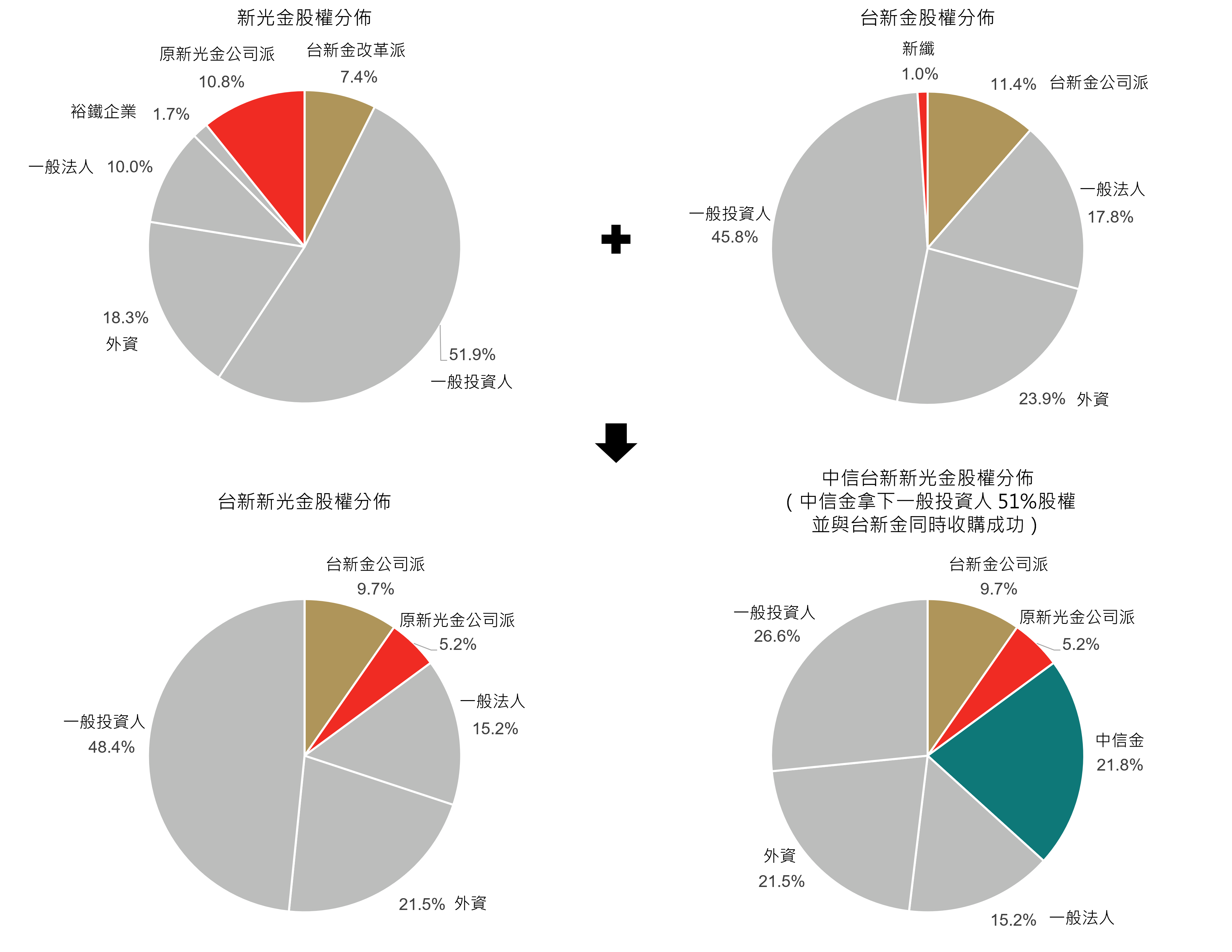 台新新光金合併後台新公司派僅擁有 9.7% 股權,除非找外援否則難以應付中信金公開收購