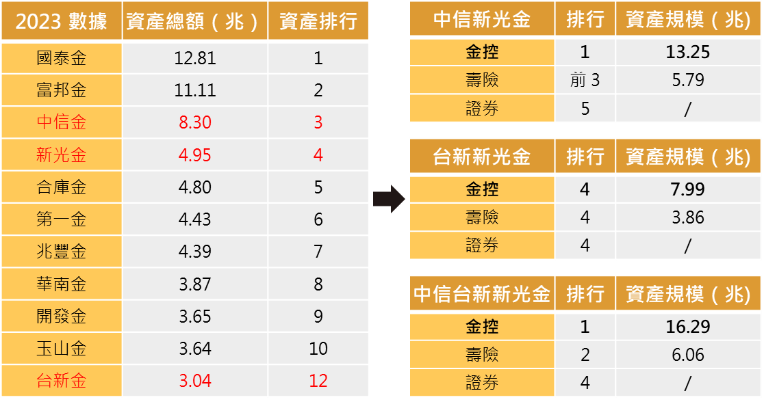 綜合以上,推估壽險是此次併購案的核心,也是新光金資產最大、最具價值的區塊,且從下表可以看出,中信金拿下新光金與否,將大幅影響其金控的地位,若沒拿下,台新新光金將以 7.99 兆資產規模逼近中信金的 8.30 兆,若是拿下,中信新光金就能以 13.25 兆的資產規模,躍居全台第一大金控,如此大的誘因也讓中信金選擇參與此次併購案的競爭。