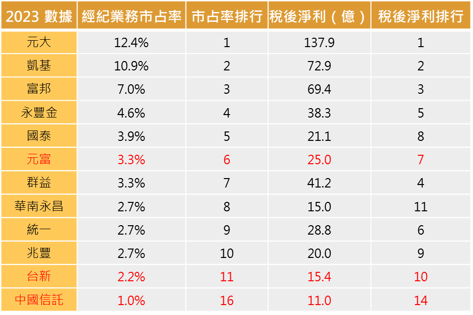 新光金旗下的元富證券也算此次併購案的一大加分項,雖然獲利佔比不比銀行、壽險高(2024H1 新光金各業務獲利占比為壽險 73%、銀行 17%、證券 10%),但中信金跟台新金的證券都是弱項,然元富證券相對而言業務完整、體質好、市占率高且獲利穩定,因此不管是台新金還是中信金拿下,都能帶來穩定獲利,並有機會透過與銀行合作產生的綜效,提升證券業務的規模,成為前五大券商。