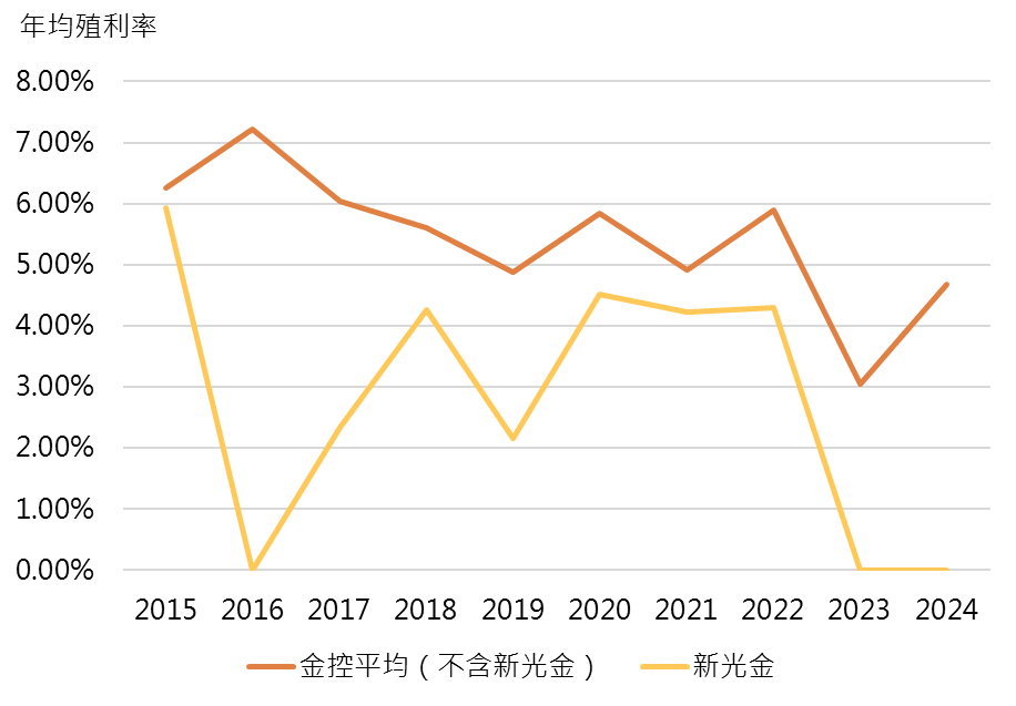 但過去新光金股價之所以大幅低於淨值,並被戲稱為「西瓜金」,就是因為體質差。不只經營狀況不佳(影子董事、宏達電虧損、雙姝衝突等事件),獲利遠低於同業,同時也因為新壽接軌 IFRS17 時資本適足率不足,導致新壽跟及母公司新光金得籌錢提升資本適足率。在經營狀況不佳、公司又得籌錢的情況下,自然就無法回饋股東適當的股利,因此在殖利率無法提升的情況下,導致股價過去低於淨值甚至是票面價值。