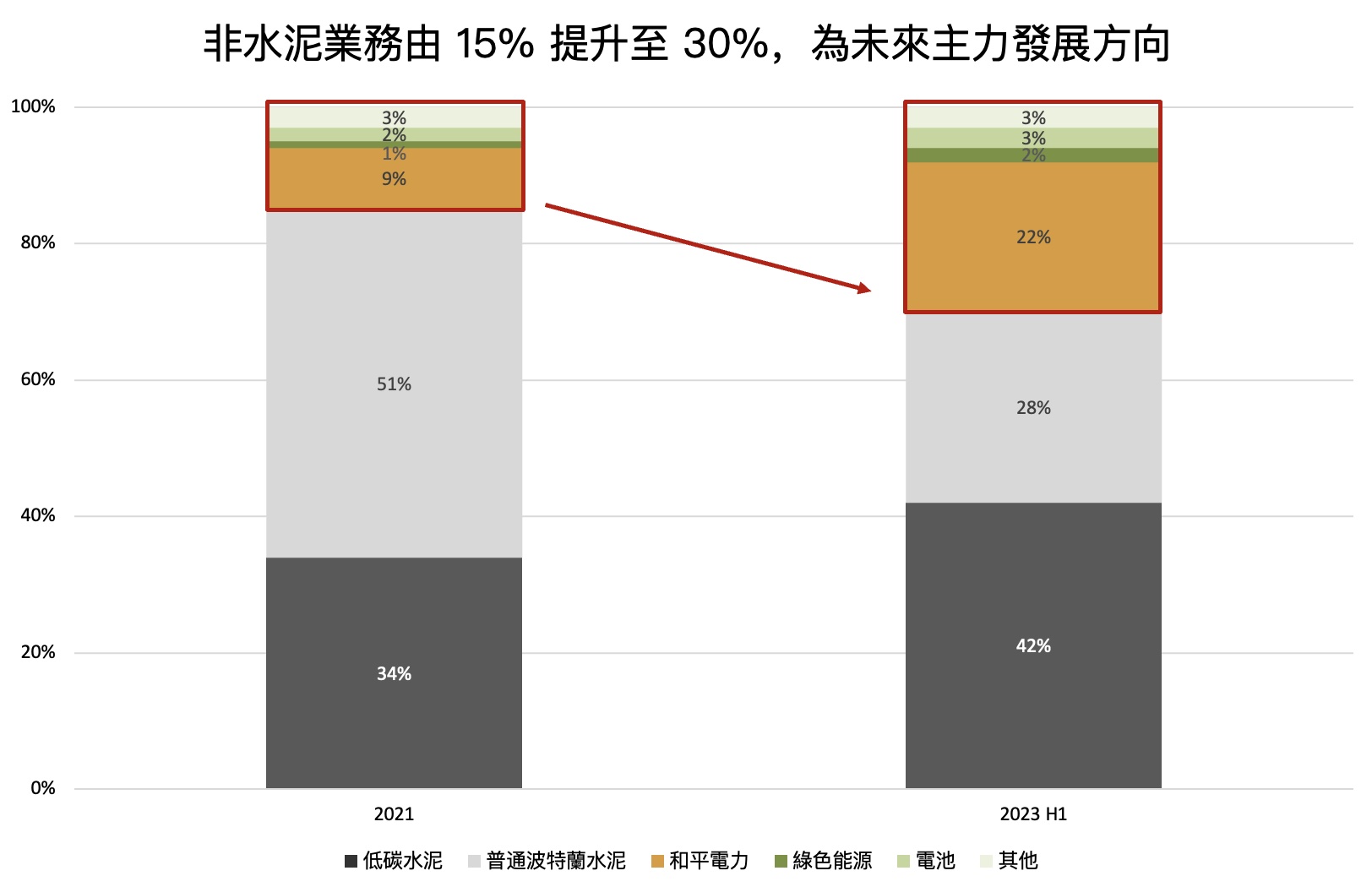 台泥(市:1101)為台灣水泥第一大廠,全台市佔率達 40%,與亞泥(市:1102)兩家公司寡占整個水泥市場。然水泥業為高碳排產業,為因應淨零碳排轉型趨勢,台泥逐步從水泥製造,轉型升級為綠色環境工程公司。近期已初見成效,2023 年上半年非水泥的營收占比 30%,且公司預估非水泥業務營收於 2025 年將提升至 50% 左右,顯見電業與綠能是公司未來策略成長方向。
