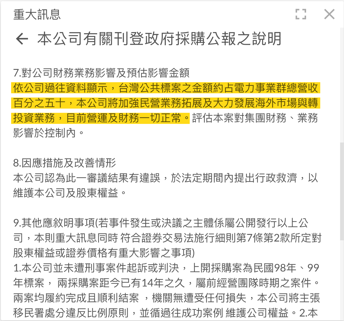 然而最新重大消息得知,大同因違反政府採購法,預估對電力相關事業衝擊約 50%,後續影響需持續追蹤。