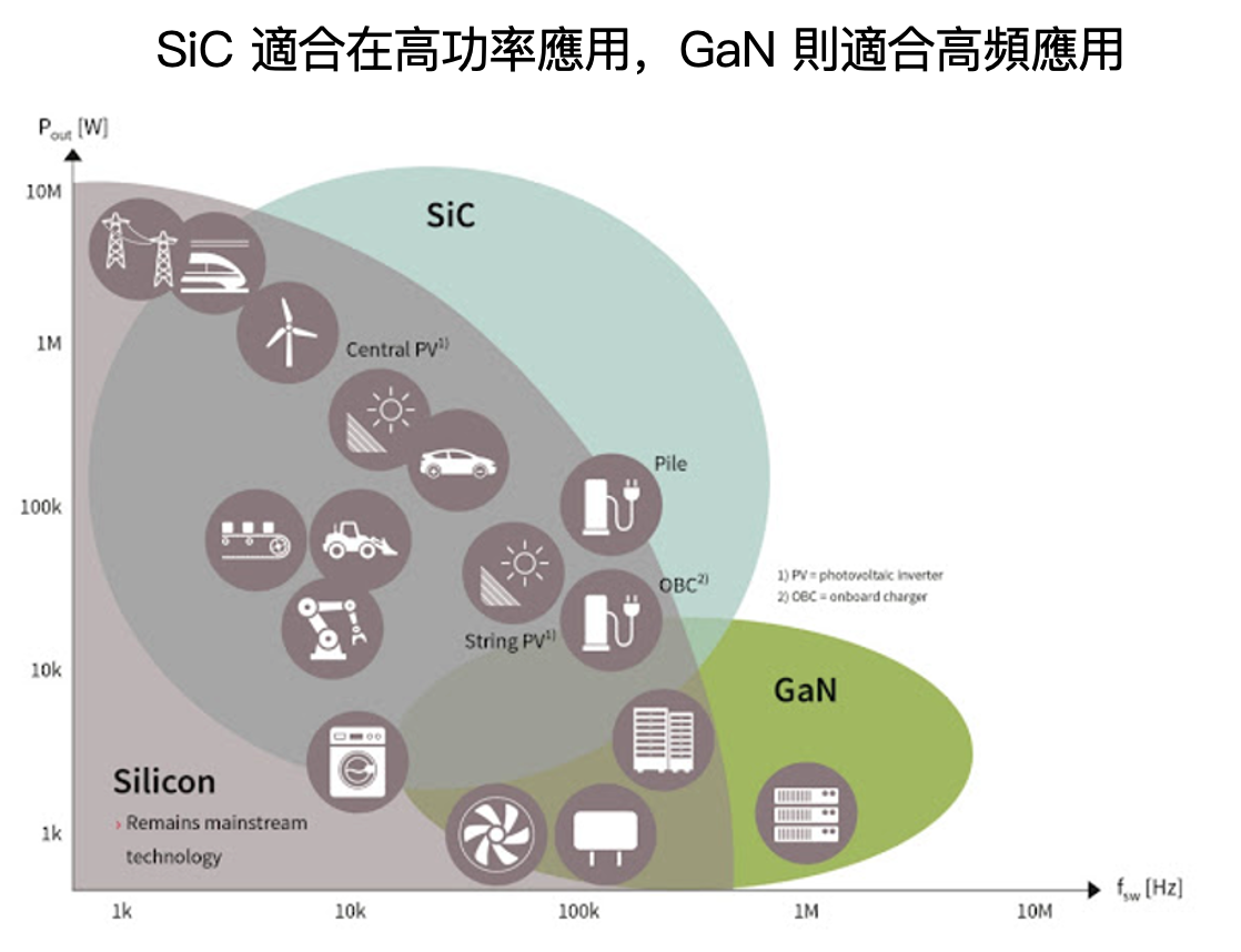 目前看來,只要需要電源轉換的零件,就都有可能改用 SiC,未來將主要被應用在逆變器、變壓器、車載充電器(OBC)以及快充充電樁。