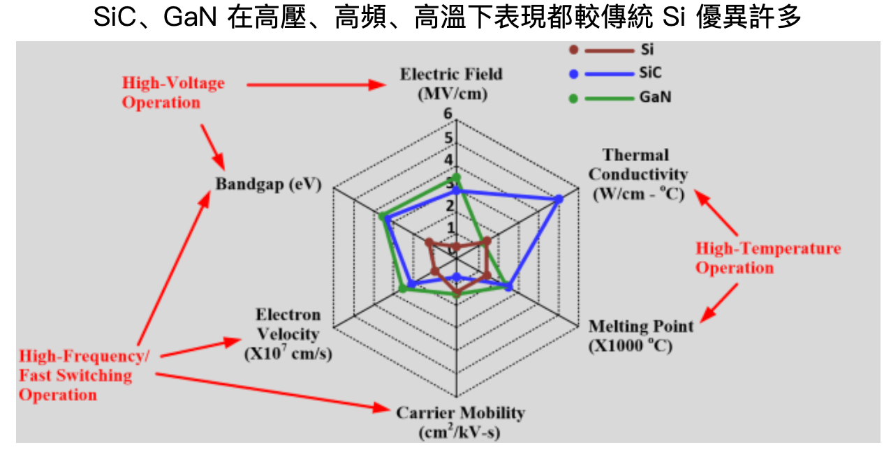 第三代半導體又稱寬能隙半導體(Wide-bandgap Semiconductor,WBG),以 SiC(碳化矽)、GaN(氮化鎵)兩種化合物半導體為代表。與傳統的 Si 相比,擁有耐高溫高壓、高功率、低耗損等優勢。以 SiC 為例,其能隙為 Si 的 3 倍,使其可承受電壓為 Si 的 10 倍,可承受溫度為 3 倍,因此非常適合用在電動車、5G 等要求高壓、大電流且須高溫運行的應用。