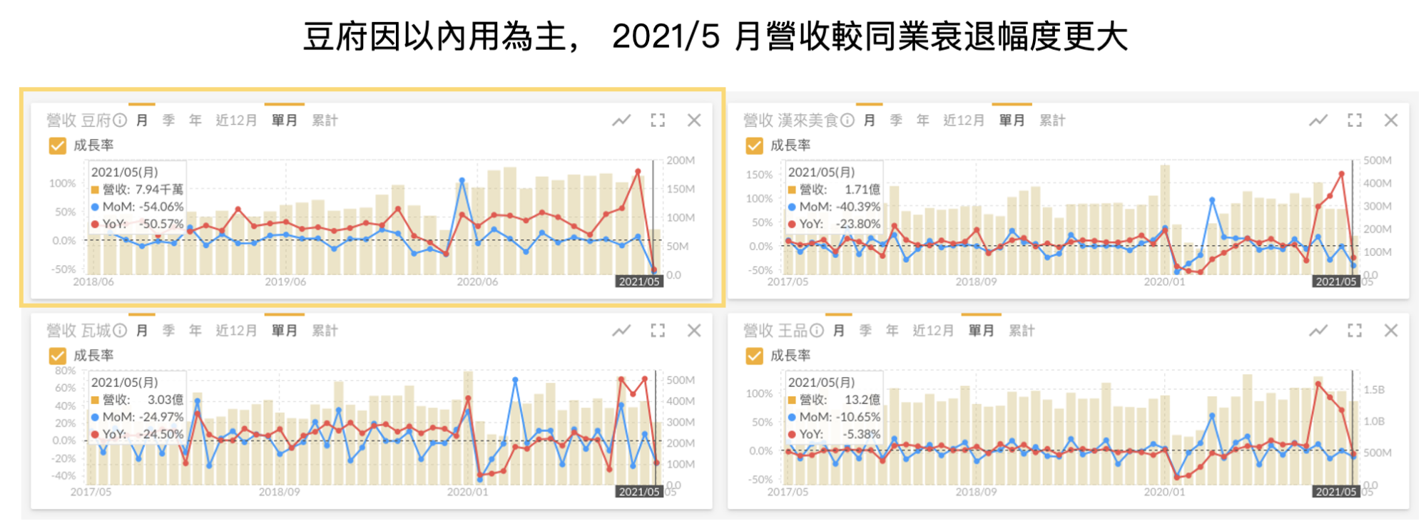 在 <餐飲業分析!韓式料理涓豆腐(豆府)> 報告提過,豆府集團主要採取店中店模式(亦即餐廳開在複合式賣場中),因此過往礙於百貨業者的限制,難以導入外送平台服務(因為百貨與餐廳採分潤抽成機制,會希望以內用為主)。在營收完全仰賴內用服務、且據點都在台灣的情況下,可看到豆府 2021/5 月營收僅有 7,940 萬元新台幣,YoY-50.6%,MoM-54.1%,和其他有外送業務或海外有營運據點的餐飲品牌如瓦城(2021/5 月營收為 3.9 億元,MoM-25.0%)、王品(2021/5 月營收為 5.4 億元,MoM-10.7%)、漢來美食(2021/5 月營收為 1.7 億元,MoM-40.4%)相比都有較大幅度的衰退。