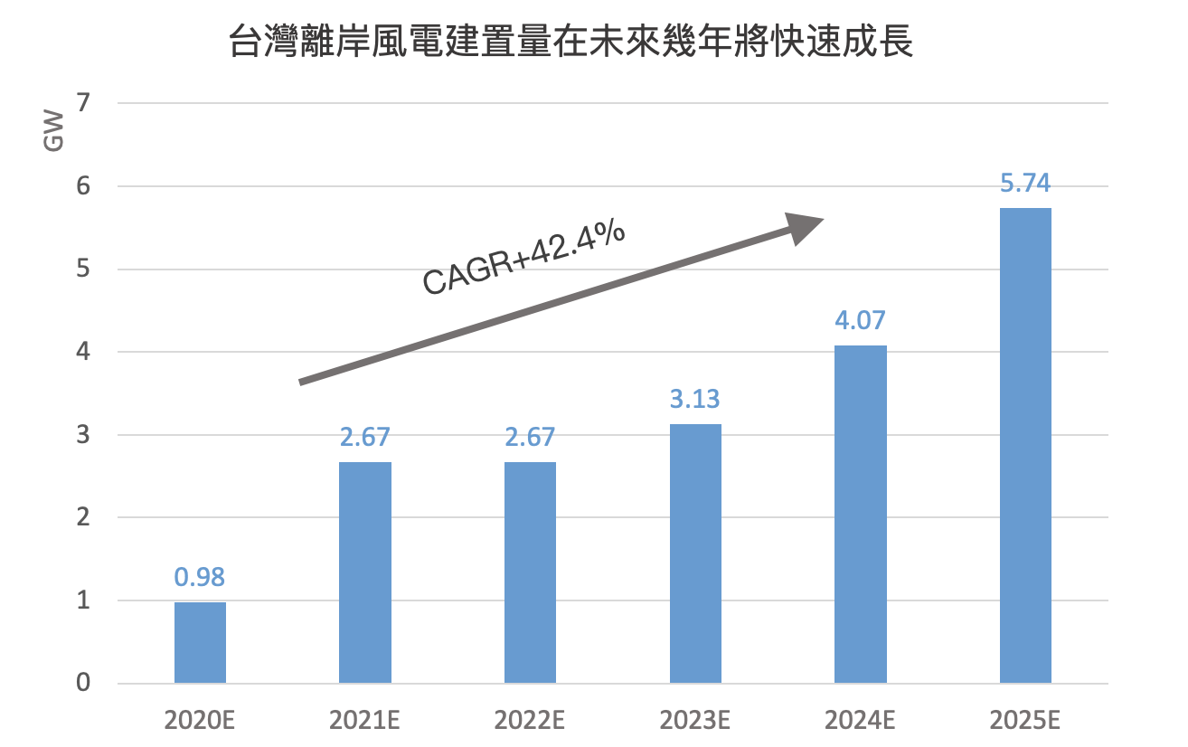 而台灣方面,在蔡政府成功連任後,也開始加大對離岸風電的投資,除了在 2019 年完工首座離岸風電示範風場,也預計台灣的離岸風電建置量將在 2025 年達到 5.7 GW(十億瓦),5 年 CAGR 達 42.4%。根據相關公司釋出的展望也表示,2022 年開始將是台灣離岸風電的大力建置期。