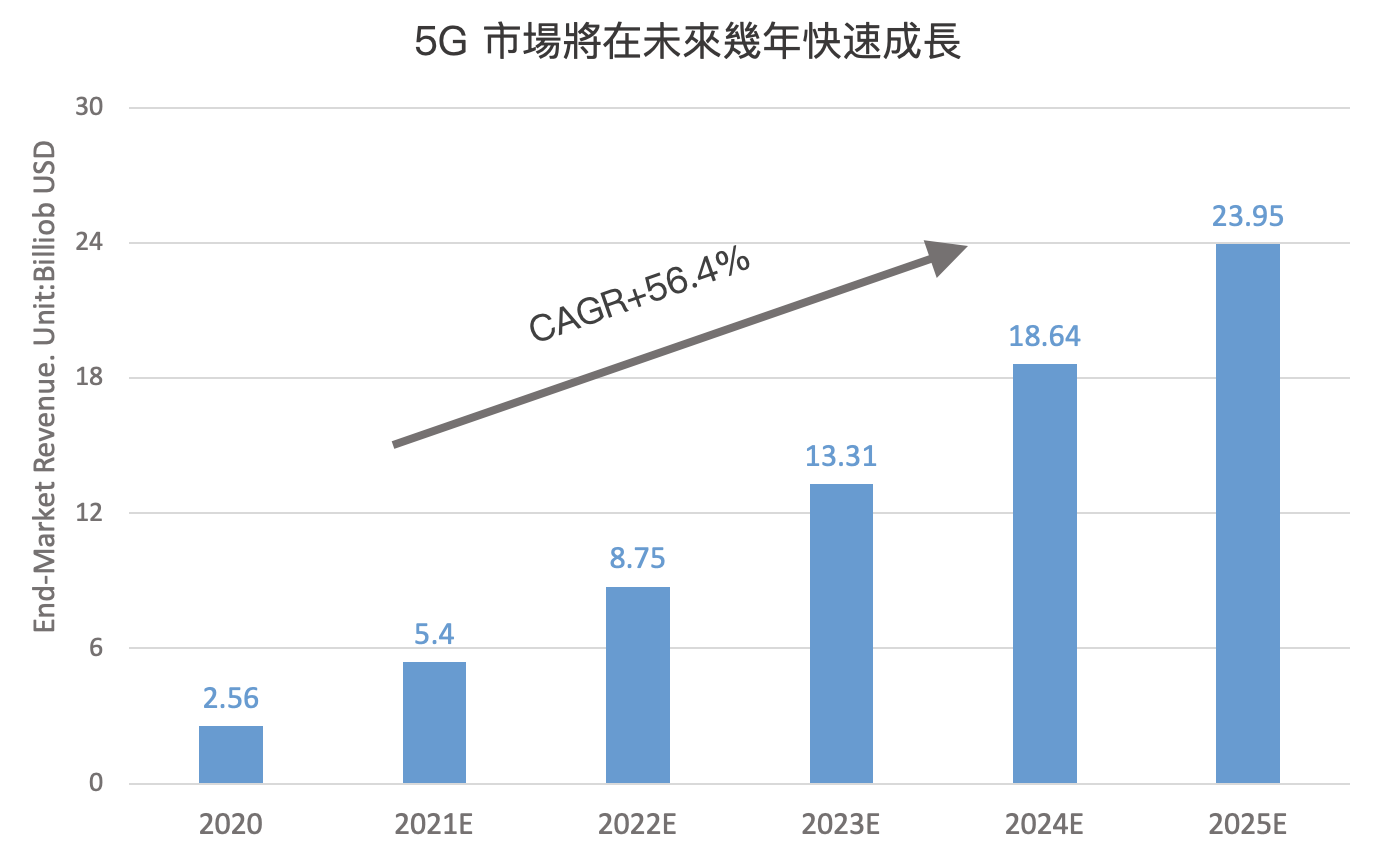 在 <白話文詳解 5G 產業,有哪些投資機會?> 報告中提到,5G 及其衍生的應用如 IoT、自駕車、AR/VR、邊緣運算、SaaS 將是未來 3~5 年的大趨勢。不過原先預期 5G 的基礎設施將在 2021 年加速佈建,卻因長短料問題而被嚴重拖緩(由於基地台晶片的附加價值較低,因此在晶片大缺貨下,連帶拖緩基地台廠商佈建速度。)