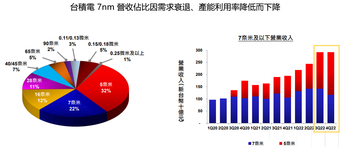 2022Q4 5nm 因 iPhone 14 放量而滿載,然展望 2023 上半年,5nm、7nm 產能利用率都將因需求減少下降