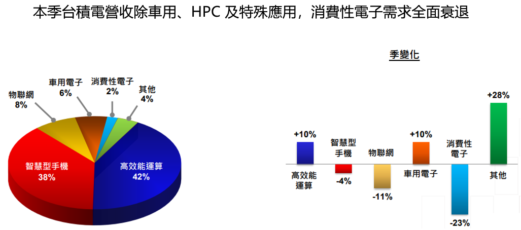 7nm 部分,因主流旗艦晶片多已轉向 5nm 製程,採用 7nm 製程的中高階手機、電腦需求又大幅衰退,也未有新產品發布,使 7nm 需求下降程度超出公司原先預期。