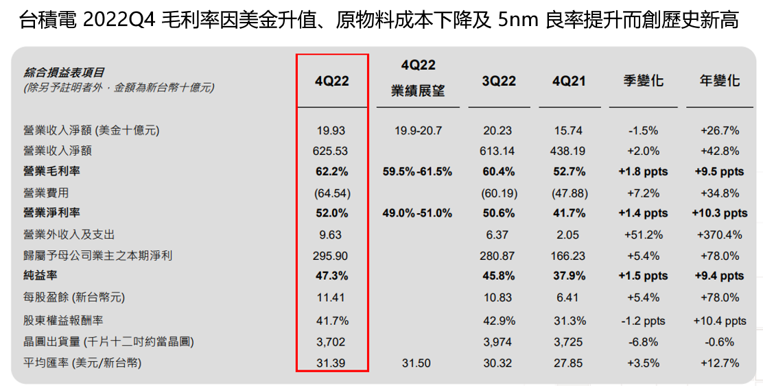 台積電 2022Q4 毛利率受惠美金升值、原物料成本下降及 5nm 良率提升而創歷史新高