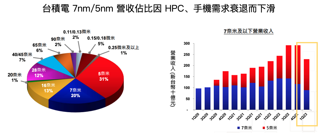 5nm/7nm 產能利用率因手機、PC 需求疲軟而降低,然預估將隨 2023 下半年新產品發布後回溫
