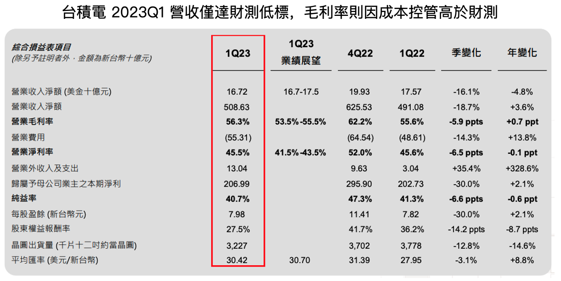 台積電 2023Q1 因產能利用率降低,營收僅達財測低標,然因成本控管得宜,毛利率超出財測及市場共識