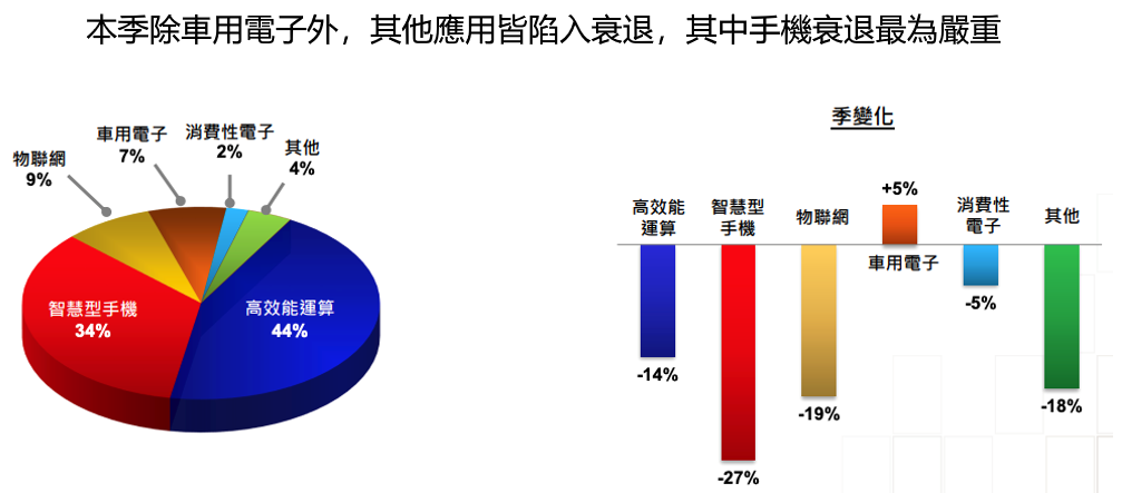 以應用別來看,本季 HPC 營收占比 44%(上季為 42%)、 智慧型手機 34%(上季 38%)、IoT 9%、車用電子 7%、消費性電子 2%、其他 4%。