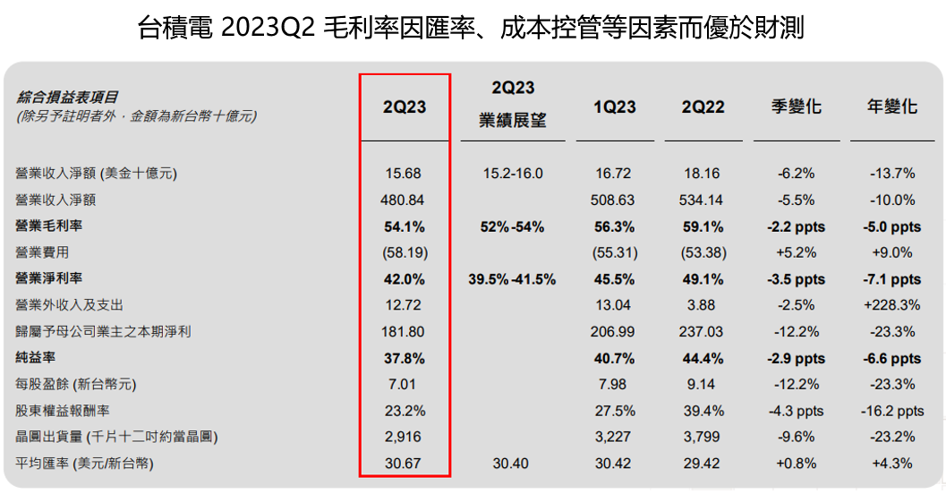 台積電 2023Q2 營運符合預期,毛利率因因成本控管得宜、新台幣兌美金貶值超出財測