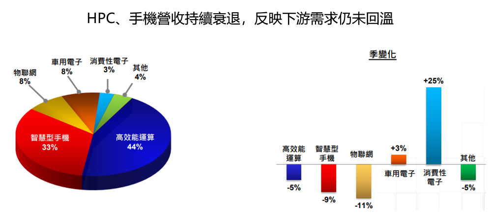 以應用別來看,本季 HPC 營收占比 44%(上季持平)、 智慧型手機 33%(上季 34%)、IoT 8%、車用電子 8%、消費性電子 3%、其他 4%。