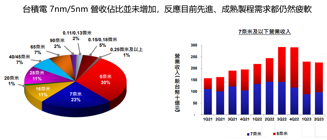 5nm 佔營收 30%(上季為 31%)、7nm 23%(上季為 20%)、16/20nm 11%、28nm 及以上 36%,其中先進製程(7nm 以下)佔比為 53%(上季為 51%)。