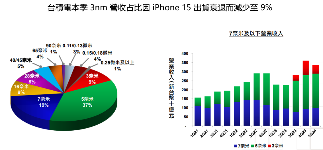 產品組合:營收佔比為 3nm 9%(上季 15%)、5nm 37%(上季為 35%)、7nm 19%(上季為 17%)、16/20nm 9%、28nm 及以上 26%。3nm 佔比下降主因 iPhone15 備貨高峰期已過,5nm 佔比提高則因目前大多主流處理器如 Nvidia 的 AI GPU(H100、B100)、AMD、Intel 的 CPU、聯發科、高通的 AP 仍使用 5nm 家族。