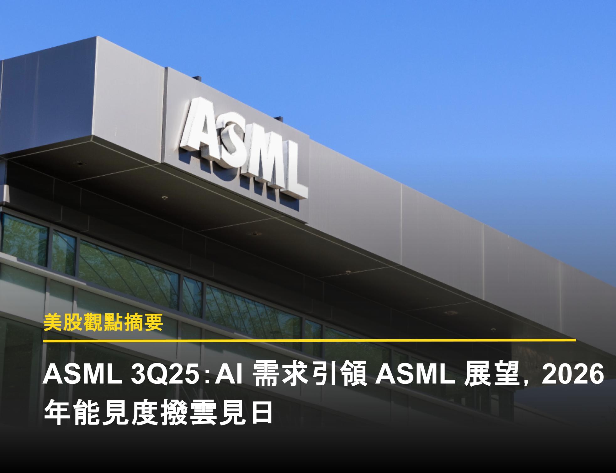 ASML(Nasdaq:ASML)於 2025 年 10 月 15 日召開 FY2025Q3(CY2025/7~9 月)電話會議,儘管單季營收 87.5 億美元略低於市場預期的 89.7 億美元,公司卻給出了明確且穩健的 2026 年營運展望,徹底消除了先前市場對於未來成長的不確定性。