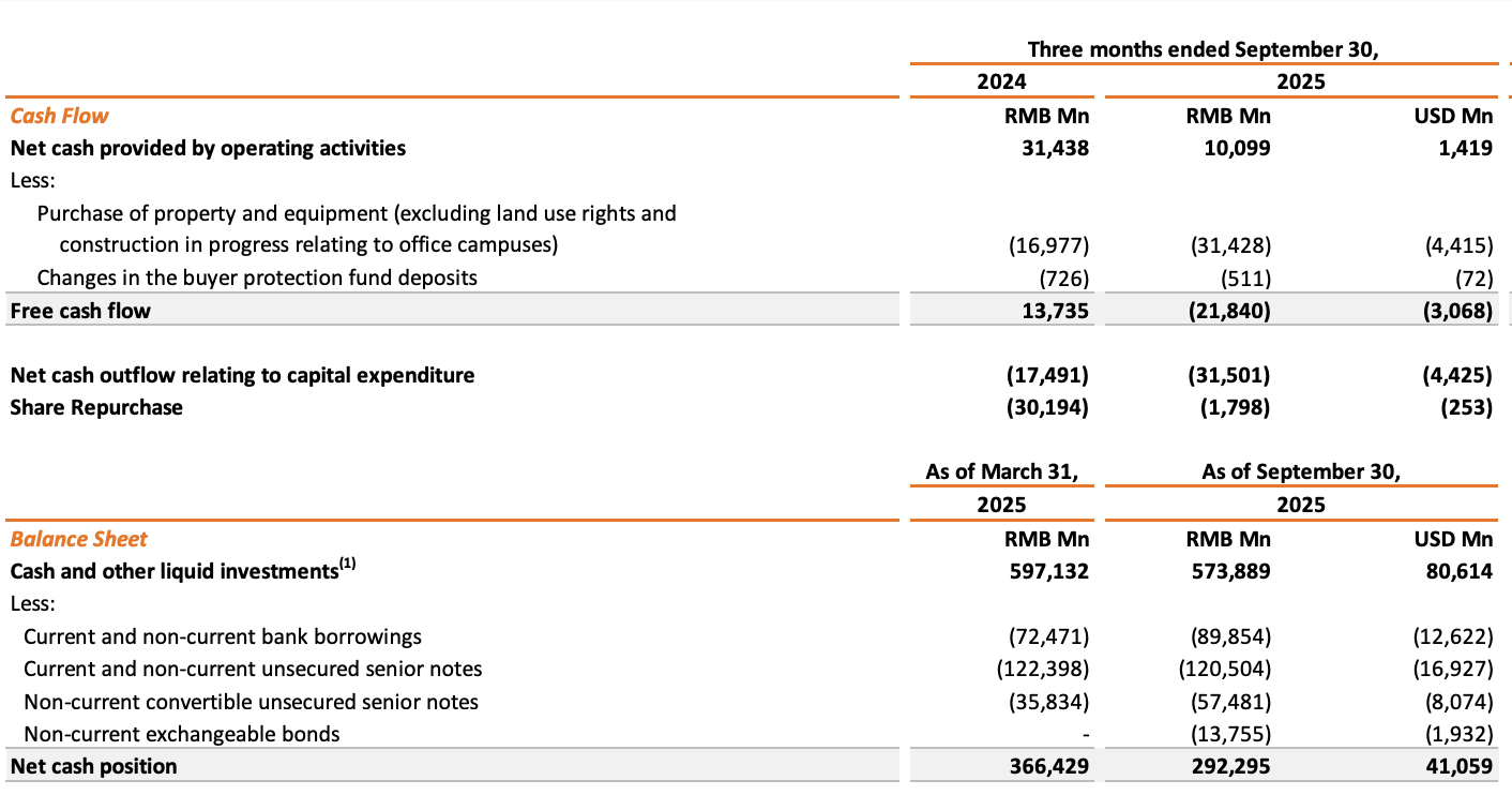 若排除已處置的高鑫零售和銀泰業務 ,Q2 總收入同比增長達 15% ,顯示出其核心業務的健康與活力 。公司管理層明確指出,目前的利潤波動是將現金流重新投入到 AI 基礎設施和快商務的戰略結果,以創造長期的戰略價值 。