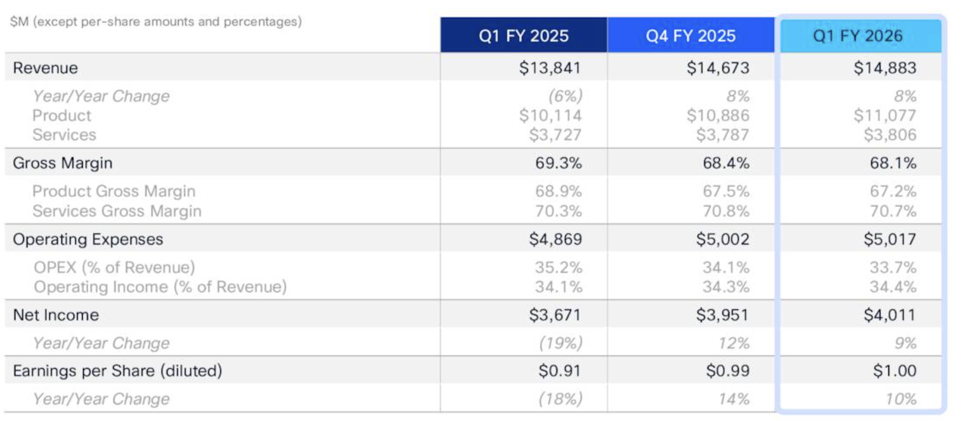 Cisco FY2026Q1 總營收達 $148.83 億 ,年增 8% ,略高於市場預期 。Non-GAAP 稀釋 EPS 達到 $1.00 ,年增 10% ,同樣優於財測高標 。公司 Non-GAAP 淨利為 $40.11 億,年增 9% 。