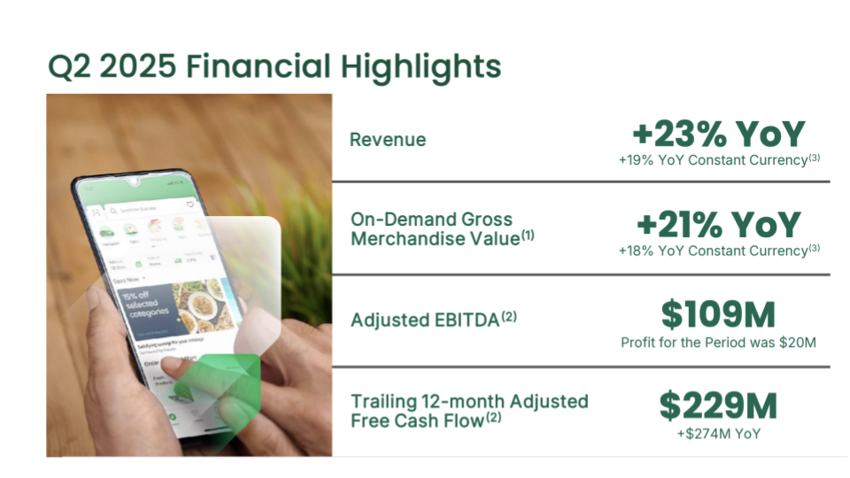Grab 在 Q2 2025 表現強勁,總營收達 8.19 億美元,年增 23% (以固定匯率計增長 19%) 。調整後 EBITDA(稅息折舊及攤銷前利潤)飆升 70%,達到 1.09 億美元 。此外,公司實現了
