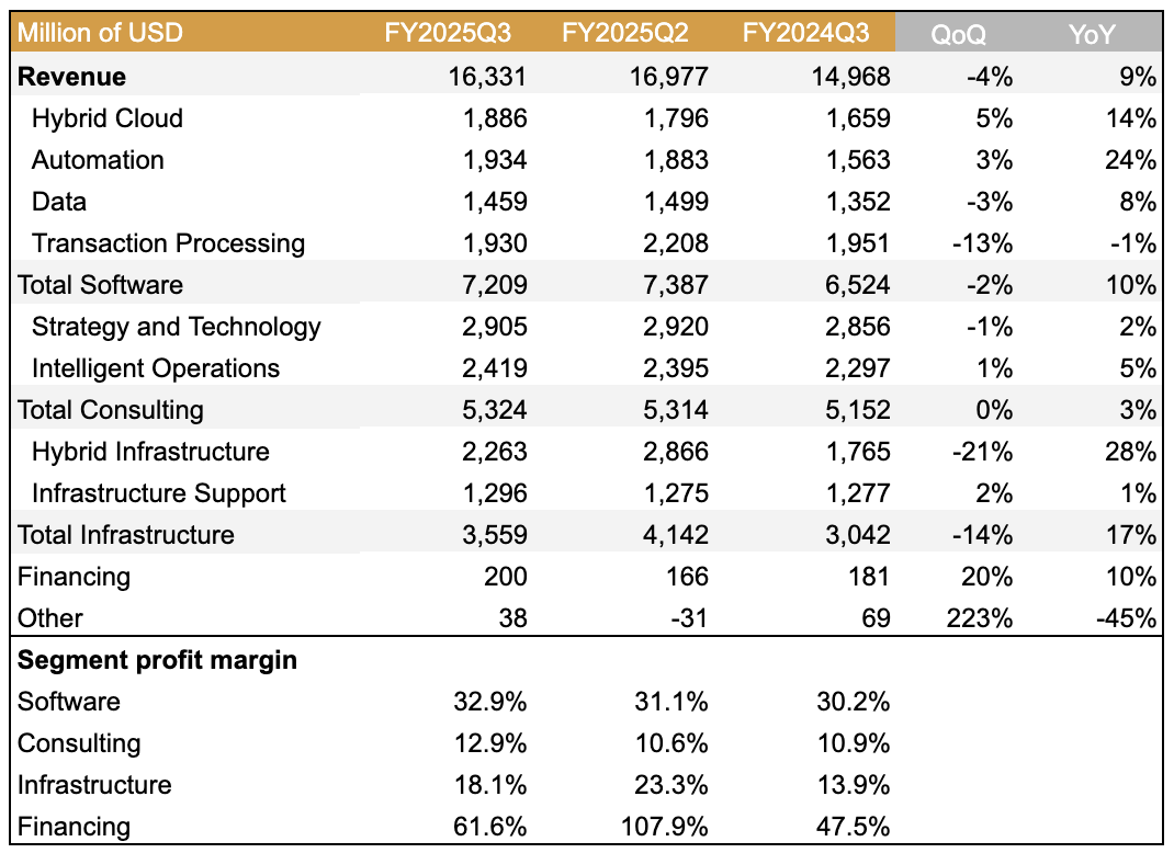 IBM 2025 年 Q3 總營收達 163 億美元,年增 9%(固定匯率 YoY+7%),超出市場預期。非 GAAP 營運毛利率達 58.7%,年增 1.2 個百分點,顯示公司在成長的同時,業務結構持續優化。