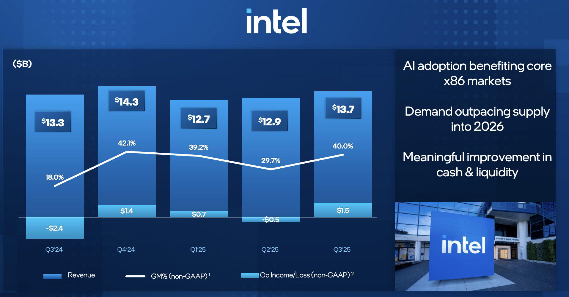 Intel Q3 營收達 $137 億,年成長 3% ,優於市場預期約 4% 。非 GAAP 每股盈餘(EPS)為 $0.23 ,顯著高於市場預期的 $0.01 。非 GAAP 毛利率為 40% ,超出管理層預期的 34% 。