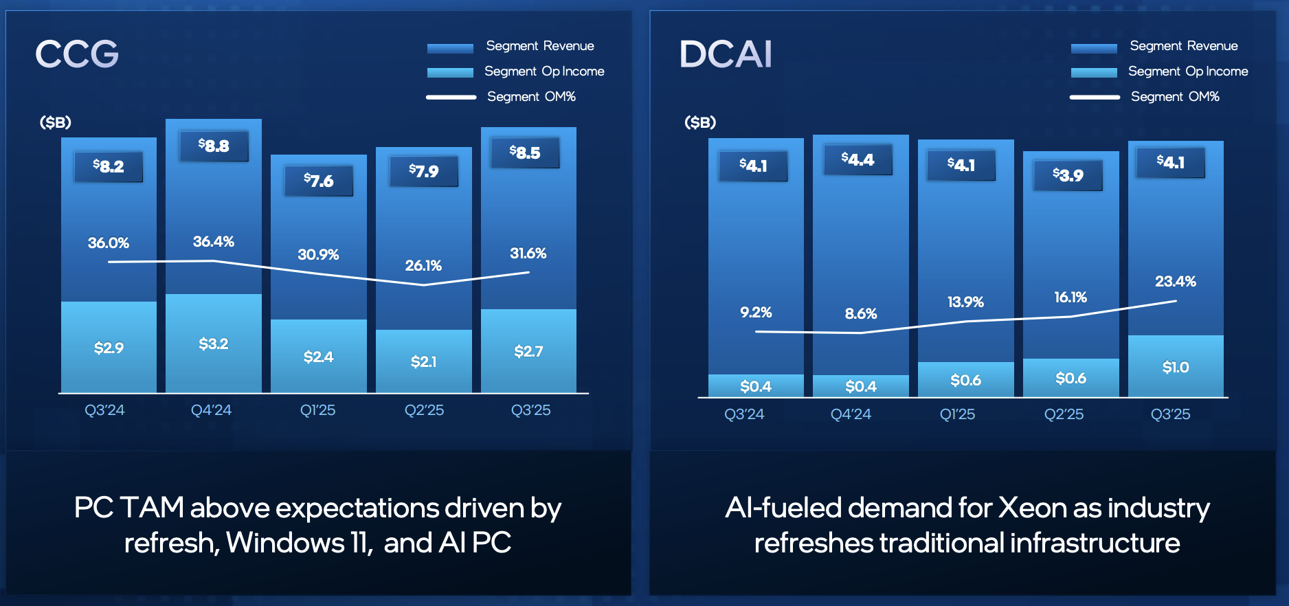 Client Computing Group (CCG):CCG 仍是 Intel 最賺錢的業務部門和主要的現金流驅動因素 。Q3 營收達 $85 億 ,年成長 16% ,季成長 8% ,表現優於預期 ,主要受 Windows 11 驅動的 PC 更新潮和 AI PC 採用增長所帶動 。然而,CCG 的營運利潤率(Operating Margin)同比下降了 44 個基點 ,這抵消了資料中心與 AI(DCAI)和 Foundry 部門的利潤改善 。
