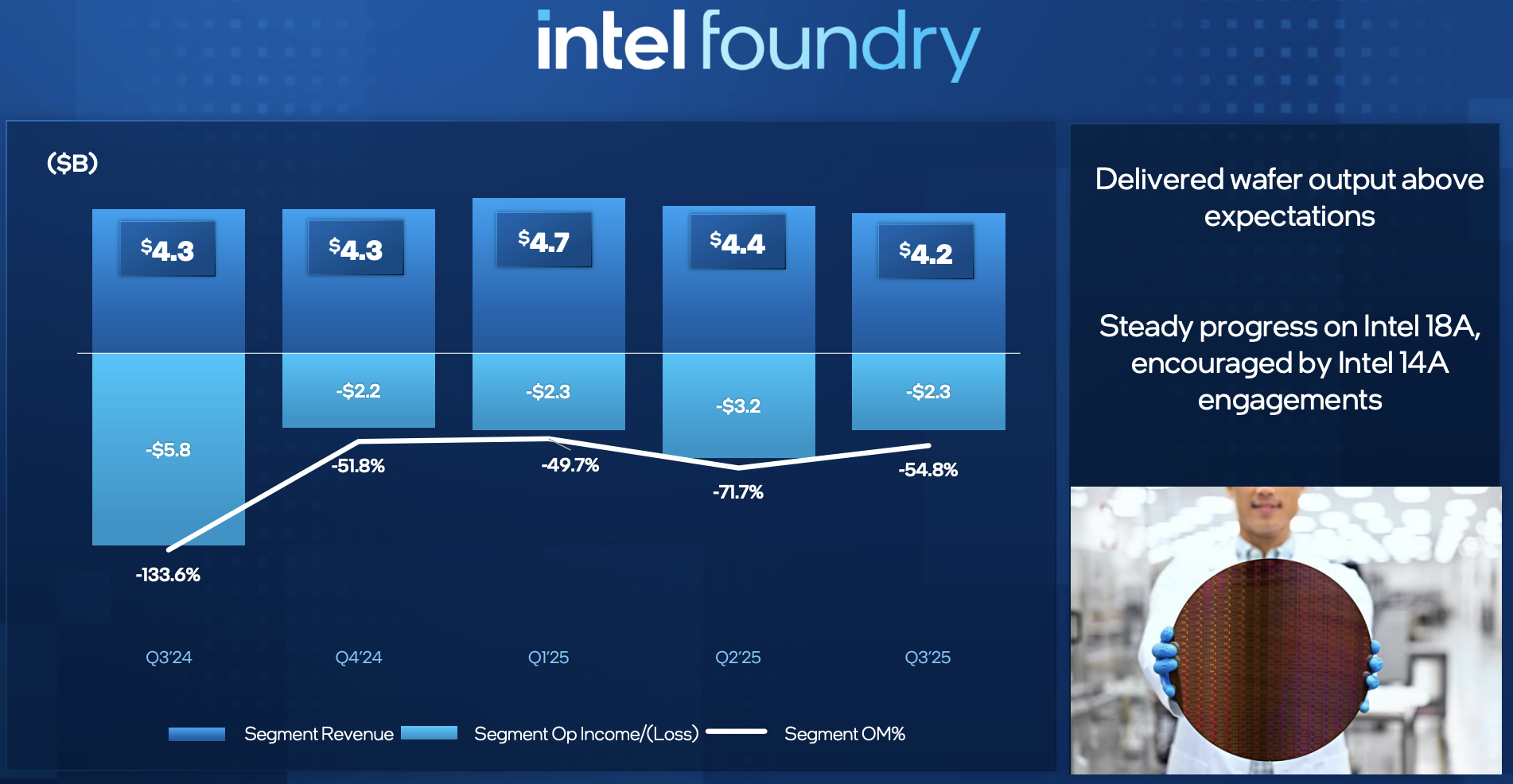 18A 進展:Intel Foundry 在 Q3 營收達 $42 億 ,營運虧損 $23 億 ,較 Q2 的虧損 $32 億有所改善 。公司持續在 Intel 18A 製程上取得穩定進展 ,並確認 Fab 52 在亞利桑那州已全面投入營運,專注於高量產製造 。
