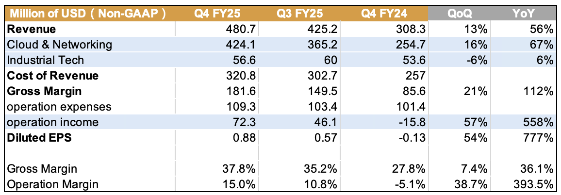 Lumentum 2025 財年第四季營收達到 4.807 億美元,Non – GAAP 每股盈餘為 0.88 美元,兩者皆超出公司上調後的預期範圍 。其中,雲端與網路部門的營收年增 67%、季增 16%,表現優異 。這種超乎預期的表現,主要歸功於超大規模雲端客戶對公司產品的強勁需求 。
