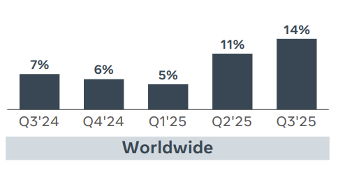 廣告定價回升,成長質量提升: Q3 廣告曝光量(Impression)YoY 增長 14%,而更關鍵的平均廣告價格(Price per Ad, PPA)同比增長 10%。這標誌著 Meta 的增長模式從過去兩年主要依靠低價曝光量、而價格下跌的狀態,成功轉變為依靠更高價值的廣告。這證明了公司在以下方面的進展: