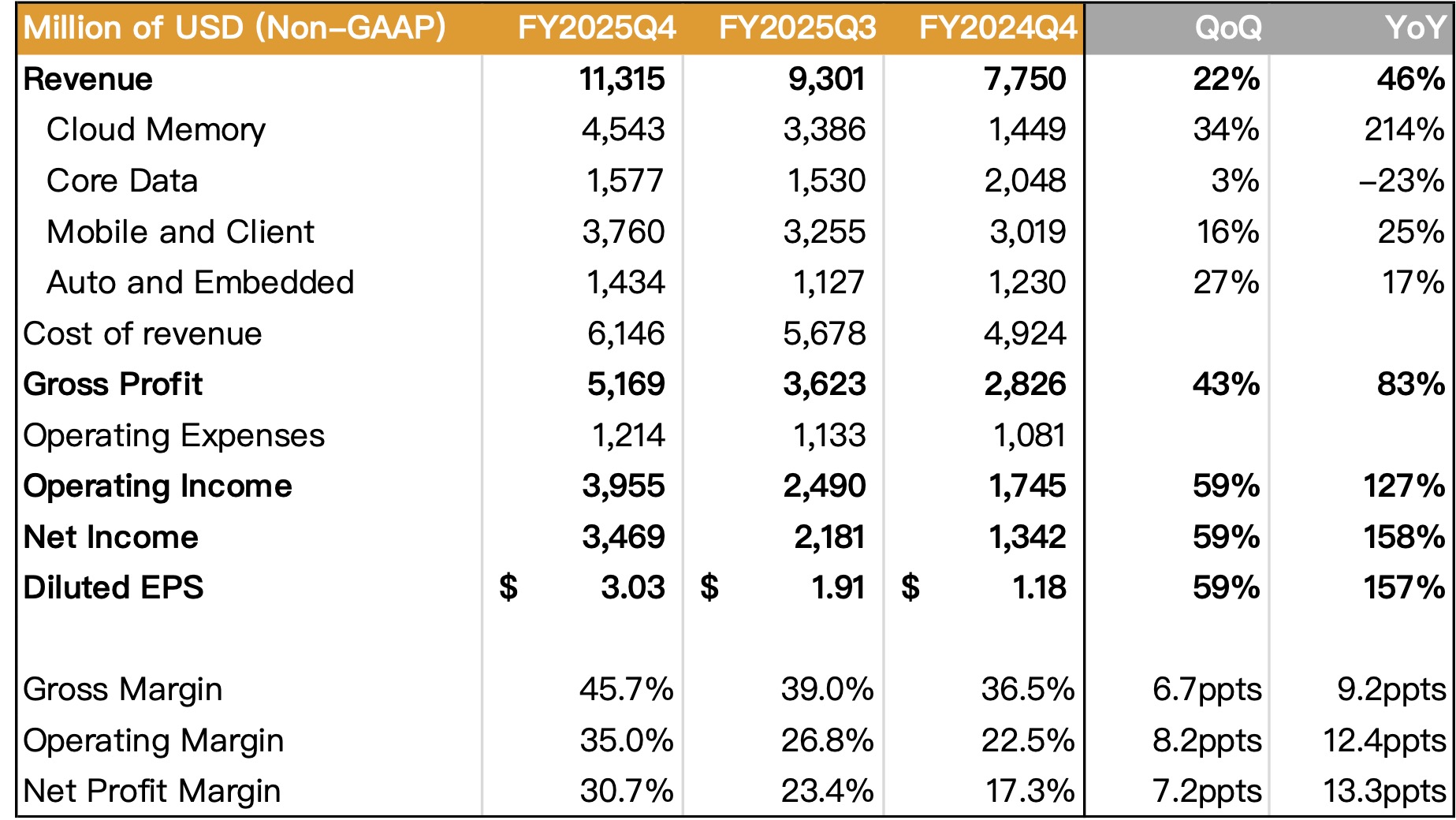美光 FY2025Q4 總營收達 113.2 億美元(以下同),YoY +46%,超出財測高標;Non-GAAP 毛利率達 45.7%,EPS 為 3.03 元,同樣優於預期。