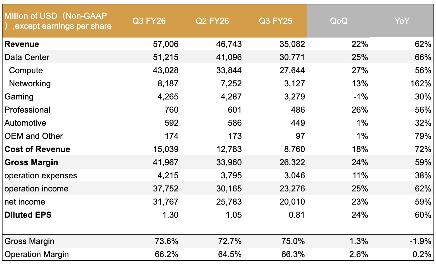 NVIDIA FY2026Q3 總營收達 $570 億美元(YoY+62%),Non-GAAP EPS 為 $1.30 元(YoY+60%),兩者均超出市場共識預期 。公司總營收實現了創紀錄的 $100 億美元季增長(QoQ+22%)。
