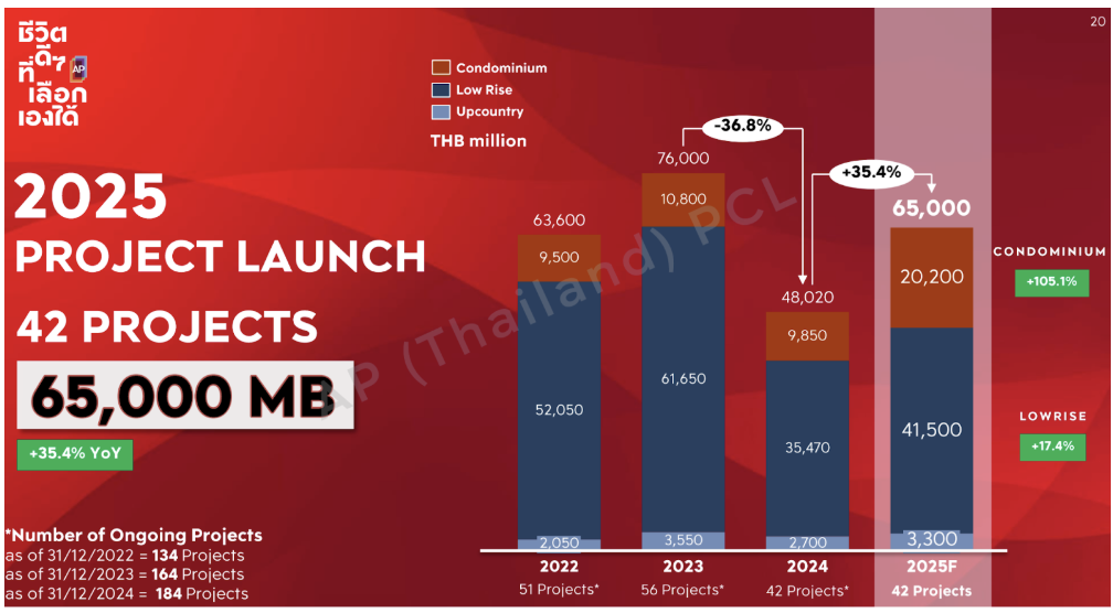 - 主要大型建商仍積極推案:泰國房地產開發商 AP (Thailand) 2025 年計畫推出 42 個新建案,總投資額 65,000 MB(百萬泰銖),年增長率達 35.4% YoY。